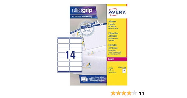 Avery L7163-100 Labels, 99.1 x 38.1 mm 14 Labels Per Sheet, 1400 ... Brand : AVERY. Application/Usage : Mailing & Shipping. Material : Paper. Label Size : 99.1 x 38.1mm. Adhesive Type : Permanent. Shape : Rectangle.